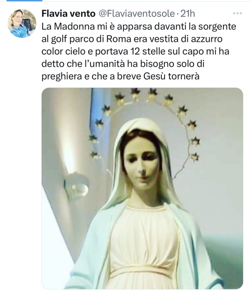 In un tweet rivelatore su X la showgirl romana Flavia Vento rivela ai suoi numerosi followers di aver avuto un incontro con la Madonna. “Mi è apparsa davanti la sorgente al Parco di Roma Golf Club. Era vestita di azzurro color cielo e portava 12 stelle sul capo. Mi ha detto che l’umanità ha bisogno solo di preghiera e che a breve Gesù tornerà”.