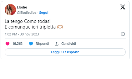 In merito, l’artista ha pubblicato un tweet parlando del suo vestito provocante esibito durante l’ultimo concerto e del dilemma sul fatto che portasse o meno la biancheria intima. Dopo una frase che ricorda molto quella pronunciata da Laura Pausini per un episodio simile, anche se allora si trattava di un incidente, una svista, ha scritto: “E comunque ieri tripletta”, con una emoji di due mani che formano un cuore.