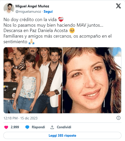 Il collega è incredulo dinanzi alla tragedia: Daniela è morta all’improvviso, ma al momento non è stata resa nota la motivazione del decesso. La famiglia chiede la massima riservatezza e il rispetto della privacy per la situazione. La Costa ha lavorato nel teatro, nel cinema e per il piccolo schermo spagnolo per circa vent’anni. “Non posso credere alla vita. Ci siamo divertiti moltissimo a realizzare insieme ‘I miei adorabili vicini'”, ha scritto Munoz. “Risposa in pace Daniela Costa – concludendo il suo messaggio -. Famiglia e amici più cari, vi sono vicino”.